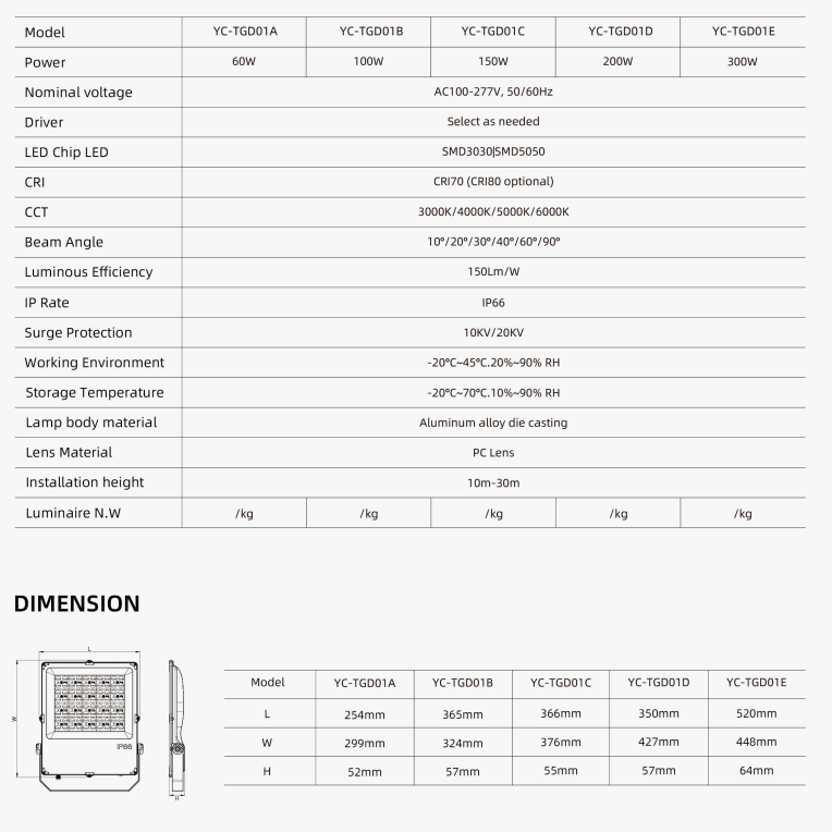 | YC-TGD01-50W | 358*294*52 | 50w | Heat sink Aluminum body,Glass,Bracket,304 screws, PCB, OBJEKTIV. |
